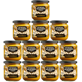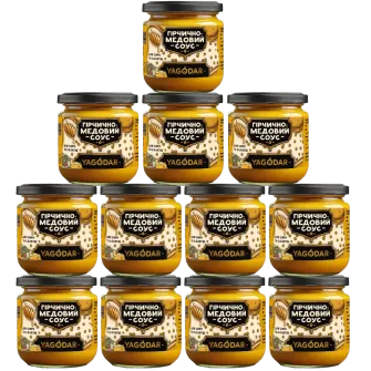 - Гірчиця порошок; Гірчиця зерна; Мед натуральний; Оцет яблучний; Олія соняшникова рафінована; Вода; Цукор; Сіль; Кріп сухий; Паприка солодка мелена.